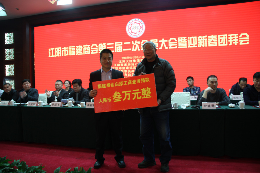 2015年1月27日,江阴市福建商会在江阴国际大酒店召开江阴市福建商会第三届二次会员大会暨迎新春团拜会。会议通过了由黄奇评会长代表理事会作了“适应新常态、追求新发展,江阴市福建商会2014年工作报告”;由常务副会长、监事长王友松作了2014年江阴市福建商会财务工作报告。常务副会长刘祖民宣读了“江阴市福建商会践行社会主义核心价值观倡议书”。会议由秘书长章福林主持,并对三届二次理事会有关人员变动进行了确认,会议还增补林丽云为副会长,曾政好为常务理事,黄宝锋、曾灿阳、郑祝冰为理事;会长黄奇评向原工商业者代表、江阴市政协原副主席、工商联原会长蒋祖麒捐赠了仁爱基金3万元;江阴市工商联党组书记陶建国讲了话,他充分肯定了江阴市福建商会一年来的工作,要求福建商会领导班子成员要团结带领在江阴的福建人,创新工作,稳发展,为澄闽两地的经济、社会发展,特别是为建设经济强、百姓富、环境美、文明程度高的新江阴再作新贡献,并向在澄的全体闽商拜年祝福!随后江阴市福建商会举行了隆重热烈的迎新春团拜活动。