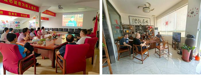 在江阴市九龙男科医院的会议室内,吴建新监事早早布置好了观看会场,组织党员职工集中收看 在江阴五金城的会员联络点,郑柄权监事组织会员即时观看大会。