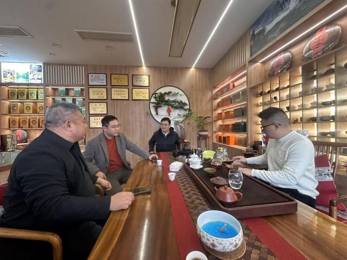 不同于前两站的 "慰问走访",第三站我们带着 "学习之心",拜访了江阴市鼎江隆商贸有限公司的张阿梅副会长。一进门,张阿梅副会长已备好茶具,娴熟地温杯、置茶、注水、出汤。"泡茶讲究'慢'与'细',水温、出汤时间都要拿捏到位。" 她一边演示,一边讲解茶道礼仪与技巧,从选茶的门道到分茶的讲究,每一个细节都倾囊相授。张阿梅副会长结合自身经验,为商会服务优化、会员资源整合、活动策划等提出了宝贵建议。